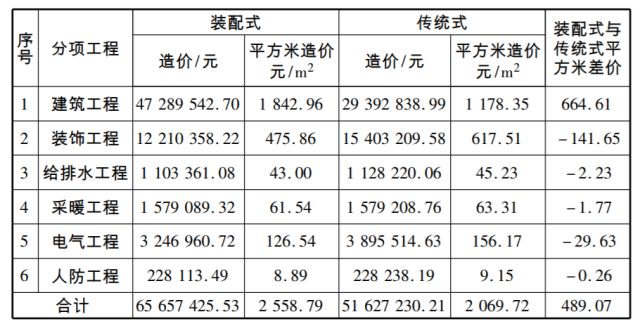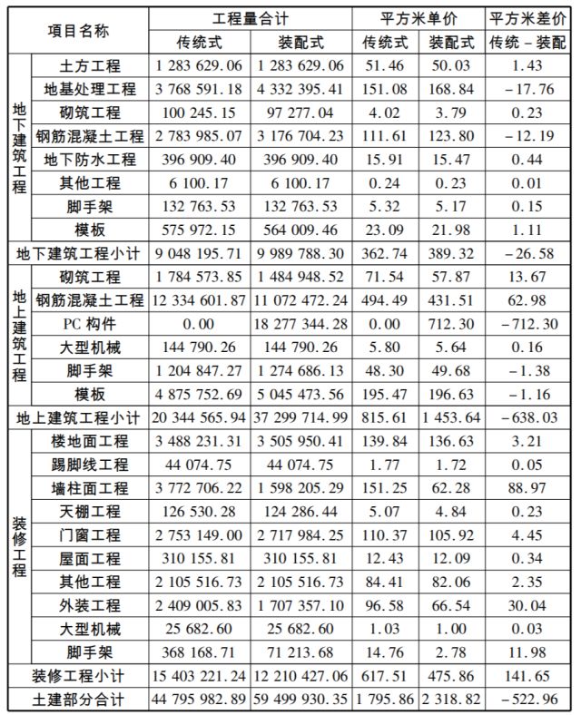 ▲某单栋楼装配式建筑与传统式建筑施工图预算造价对比表(引用:武长青;谈装配式建筑与传统式建筑造价对比分析,2017)